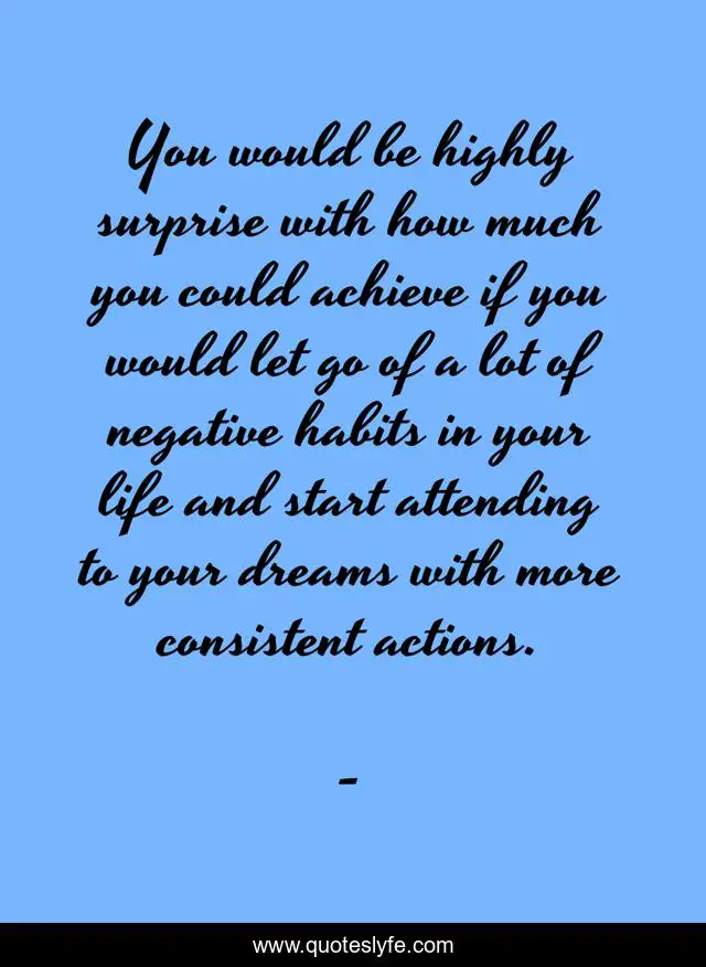 This page presents the quote "You would be highly surprise with how much you could achieve if you would let go of a lot of negative habits in your life and start attending to your dreams with more consistent actions.". Author of this quote is . This quote is about negative-habits, achieve-more-success, lettting-go-of-negativity, attending-to-your-dreams, edmond-mbiaka, achieving-more-in-your-life, consistent-actions,.