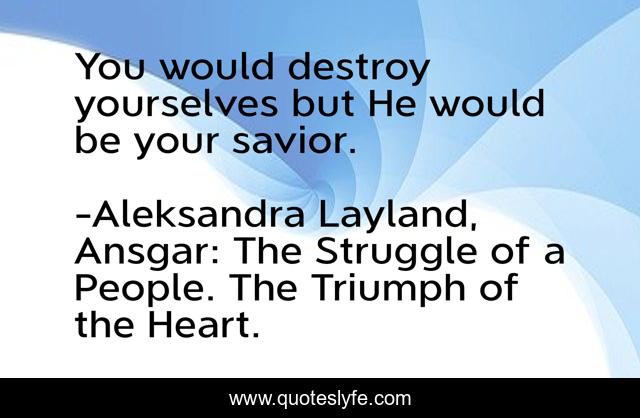 This page presents the quote "You would destroy yourselves but He would be your savior.". Author of this quote is Aleksandra Layland, Ansgar: The Struggle of a People. The Triumph of the Heart.. This quote is about salvation, god-s-love, destruction-of-us, mankind,.