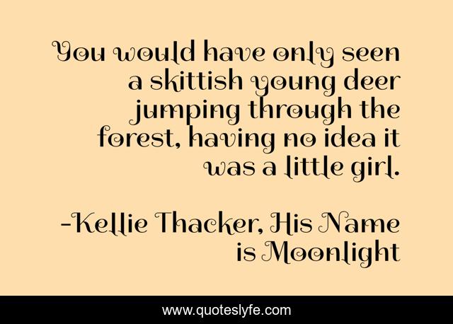 This page presents the quote "You would have only seen a skittish young deer jumping through the forest, having no idea it was a little girl.". Author of this quote is Kellie Thacker, His Name is Moonlight. This quote is about abna, shape-shifter, christian-fiction, new-adult, fantasy, supernatural, his-name-is-moonlight, young-adult,.