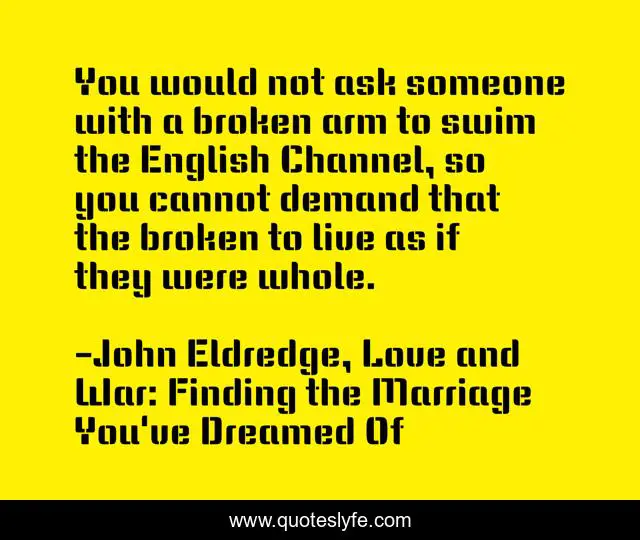 This page presents the quote "You would not ask someone with a broken arm to swim the English Channel, so you cannot demand that the broken to live as if they were whole.". Author of this quote is John Eldredge, Love and War: Finding the Marriage You've Dreamed Of. This quote is about restoration, brokenness, healing, regeneration,.