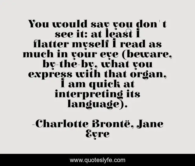 This page presents the quote "You would say you don't see it: at least I flatter myself I read as much in your eye (beware, by-the-by, what you express with that organ, I am quick at interpreting its language).". Author of this quote is Charlotte Brontë, Jane Eyre. .