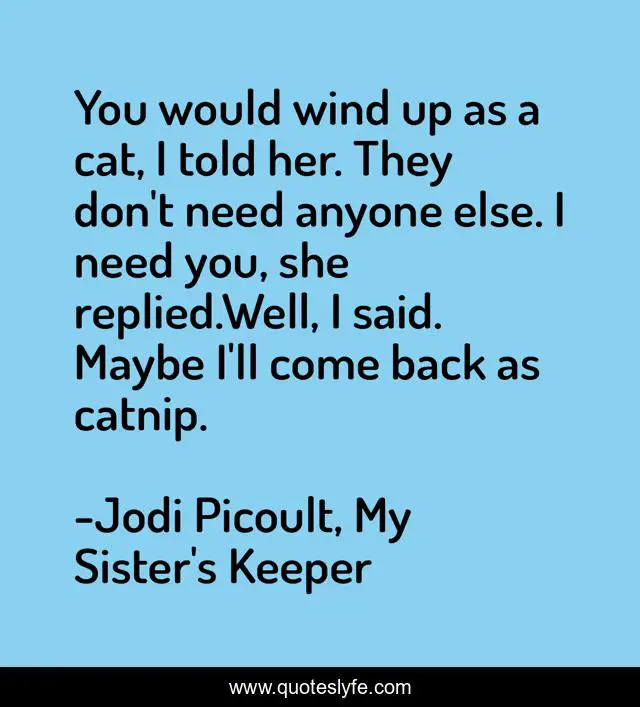 This page presents the quote "You would wind up as a cat, I told her. They don't need anyone else. I need you, she replied.Well, I said. Maybe I'll come back as catnip.". Author of this quote is Jodi Picoult, My Sister's Keeper. This quote is about reincarnation, cat, jodi-picoult, my-sister-s-keeper, wit,.