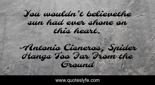 This page presents the quote "You wouldn’t believethe sun had ever shone on this heart.". Author of this quote is Antonio Cisneros, Spider Hangs Too Far From the Ground. This quote is about quote, heartbreak, bitterness, quotes,.