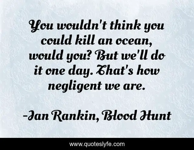 This page presents the quote "You wouldn't think you could kill an ocean, would you? But we'll do it one day. That's how negligent we are.". Author of this quote is Ian Rankin, Blood Hunt. This quote is about environment, nature, oceans, preservation, pollution,.