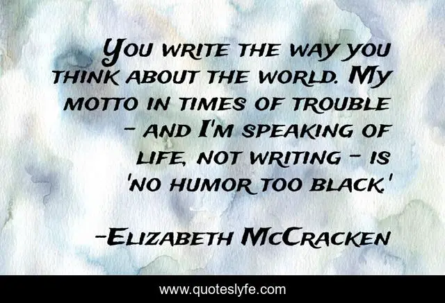 This page presents the quote "You write the way you think about the world. My motto in times of trouble - and I'm speaking of life, not writing - is 'no humor too black.'". Author of this quote is Elizabeth McCracken. This quote is about life, motto, writing,.