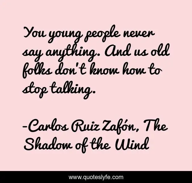 This page presents the quote "You young people never say anything. And us old folks don't know how to stop talking.". Author of this quote is Carlos Ruiz Zafón, The Shadow of the Wind. .