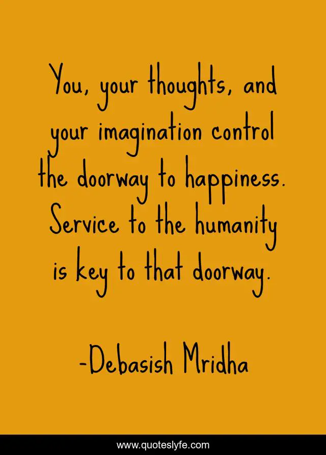 This page presents the quote "You, your thoughts, and your imagination control the doorway to happiness. Service to the humanity is key to that doorway.". Author of this quote is Debasish Mridha. This quote is about control, life, love, knowledge, service, inspirational, intelligence, philosophy, wisdom,.