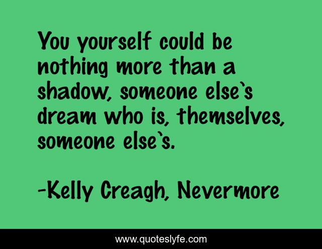 This page presents the quote "You yourself could be nothing more than a shadow, someone else’s dream who is, themselves, someone else’s.". Author of this quote is Kelly Creagh, Nevermore. This quote is about nevermore, kelly-creagh, dream,.
