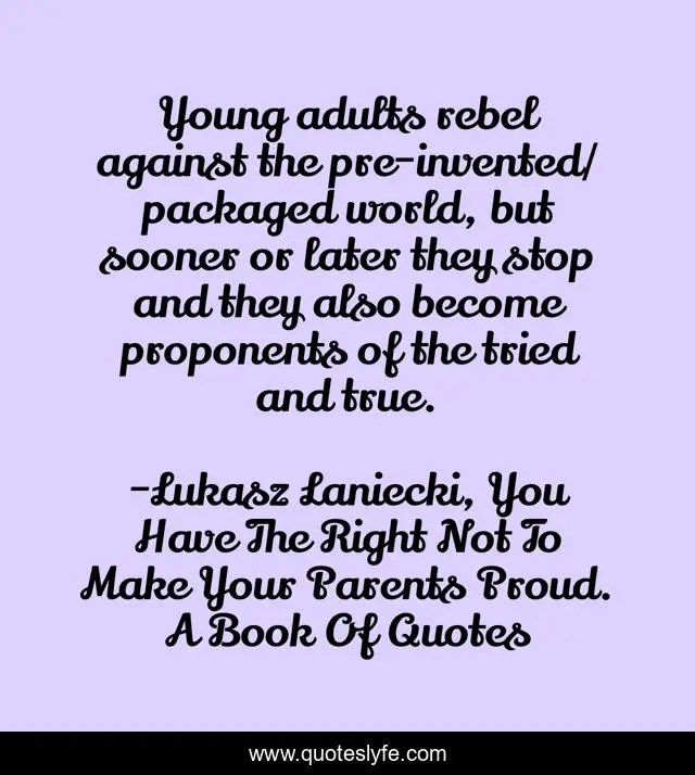 This page presents the quote "Young adults rebel against the pre-invented/ packaged world, but sooner or later they stop and they also become proponents of the tried and true.". Author of this quote is Lukasz Laniecki, You Have The Right Not To Make Your Parents Proud. A Book Of Quotes. This quote is about society, human-behaviour, life, young-adults, inertia,.