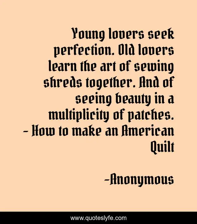 This page presents the quote "Young lovers seek perfection. Old lovers learn the art of sewing shreds together. And of seeing beauty in a multiplicity of patches. - How to make an American Quilt". Author of this quote is Anonymous. This quote is about love, how-to-make-an-american-quilt, young-lovers, perfection, old-lovers, affection,.