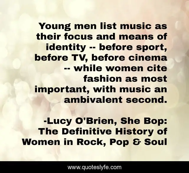 This page presents the quote "Young men list music as their focus and means of identity -- before sport, before TV, before cinema -- while women cite fashion as most important, with music an ambivalent second.". Author of this quote is Lucy O'Brien, She Bop: The Definitive History of Women in Rock, Pop & Soul. .