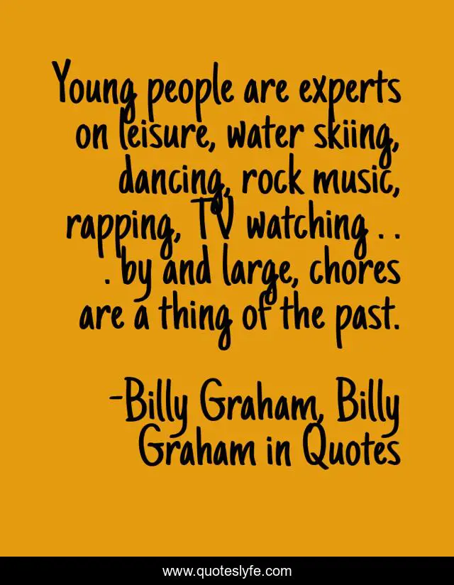 This page presents the quote "Young people are experts on leisure, water skiing, dancing, rock music, rapping, TV watching . . . by and large, chores are a thing of the past.". Author of this quote is Billy Graham, Billy Graham in Quotes. This quote is about young-people, billy-graham,.