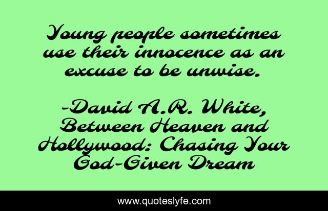 This page presents the quote "Young people sometimes use their innocence as an excuse to be unwise.". Author of this quote is David A.R. White, Between Heaven and Hollywood: Chasing Your God-Given Dream. This quote is about youth, innocence, wisdom,.
