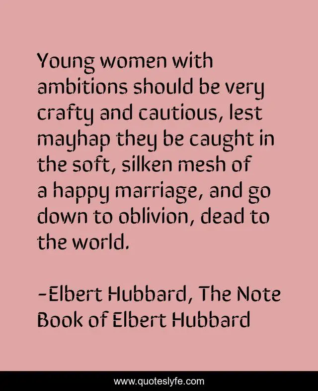 This page presents the quote "Young women with ambitions should be very crafty and cautious, lest mayhap they be caught in the soft, silken mesh of a happy marriage, and go down to oblivion, dead to the world.". Author of this quote is Elbert Hubbard, The Note Book of Elbert Hubbard. .
