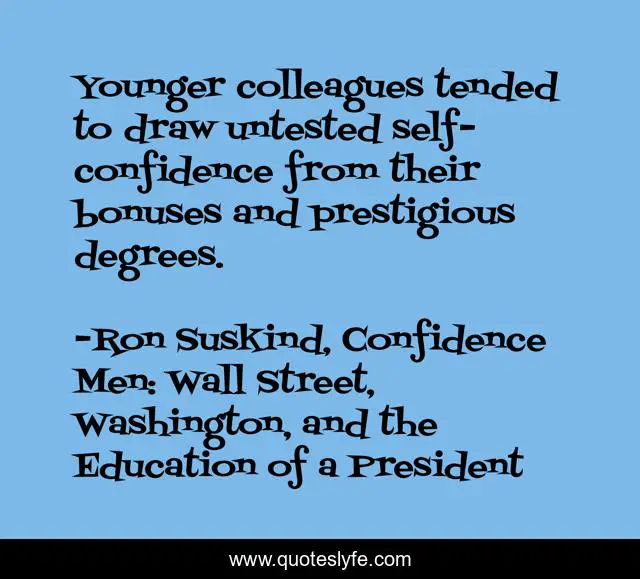 This page presents the quote "Younger colleagues tended to draw untested self-confidence from their bonuses and prestigious degrees.". Author of this quote is Ron Suskind, Confidence Men: Wall Street, Washington, and the Education of a President. This quote is about inexperience, arrogance, immaturity,.