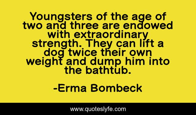 This page presents the quote "Youngsters of the age of two and three are endowed with extraordinary strength. They can lift a dog twice their own weight and dump him into the bathtub.". Author of this quote is Erma Bombeck. This quote is about age, lift, dog,.