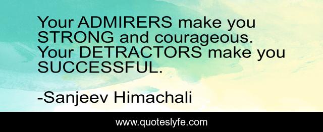 This page presents the quote "Your ADMIRERS make you STRONG and courageous. Your DETRACTORS make you SUCCESSFUL.". Author of this quote is Sanjeev Himachali. This quote is about admiration, success, detractors, success-strategies, admiration-and-attitude, sanjeev-himachali,.