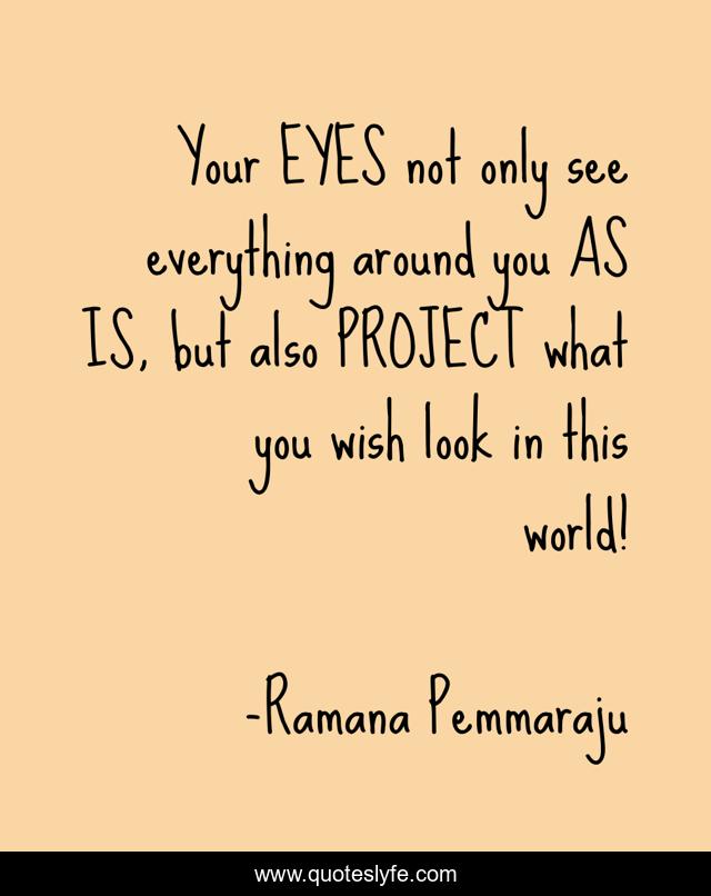 This page presents the quote "Your EYES not only see everything around you AS IS, but also PROJECT what you wish look in this world!". Author of this quote is Ramana Pemmaraju. This quote is about eyes, perception, look, watching, mind, looking, seeing-things-in-a-different-way, mind-power, projector,.