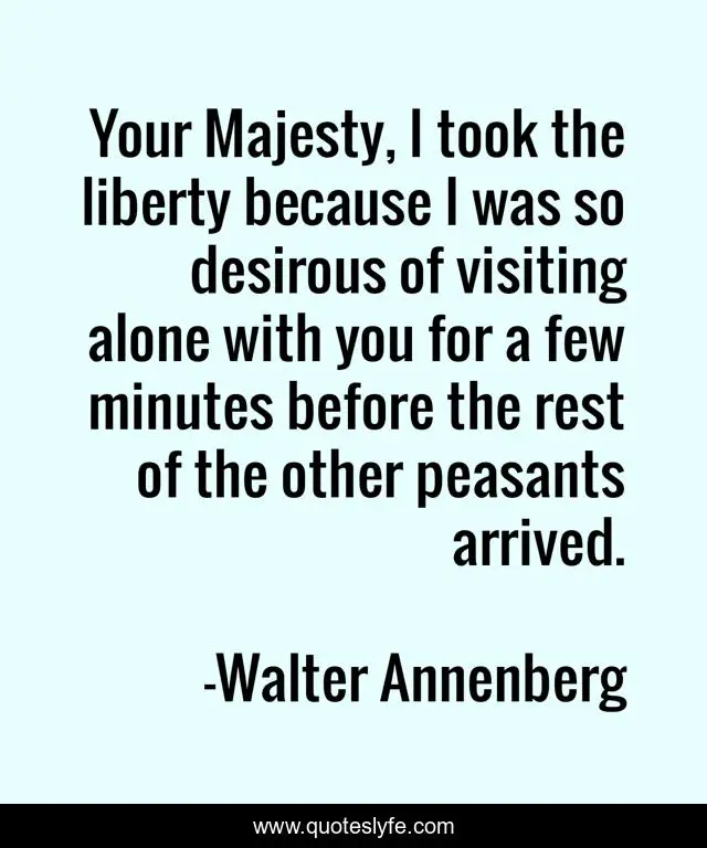 This page presents the quote "Your Majesty, I took the liberty because I was so desirous of visiting alone with you for a few minutes before the rest of the other peasants arrived.". Author of this quote is Walter Annenberg. This quote is about liberty, rest,.
