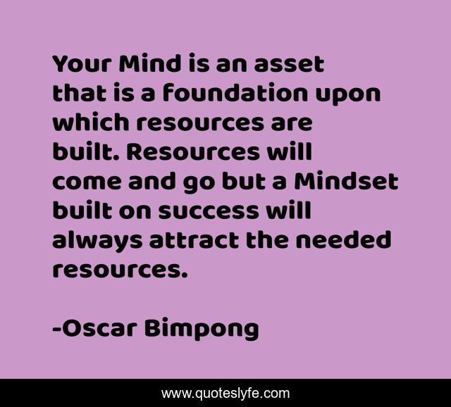 This page presents the quote "Your Mind is an asset that is a foundation upon which resources are built. Resources will come and go but a Mindset built on success will always attract the needed resources.". Author of this quote is Oscar Bimpong. This quote is about foundation, mind, asset, resources, mindset,.