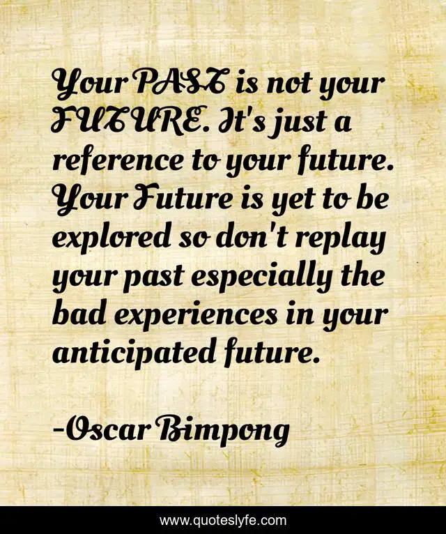 This page presents the quote "Your PAST is not your FUTURE. It's just a reference to your future. Your Future is yet to be explored so don't replay your past especially the bad experiences in your anticipated future.". Author of this quote is Oscar Bimpong. This quote is about past, anticipated-future, future, bad-experiences, reference,.