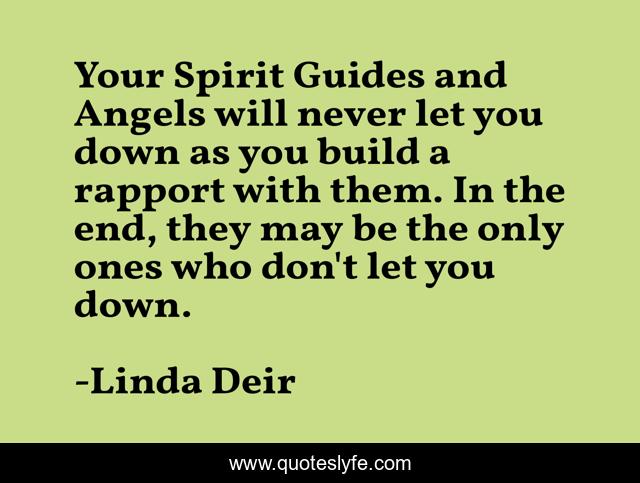 This page presents the quote "Your Spirit Guides and Angels will never let you down as you build a rapport with them. In the end, they may be the only ones who don't let you down.". Author of this quote is Linda Deir. This quote is about spirit-guides, angels,.