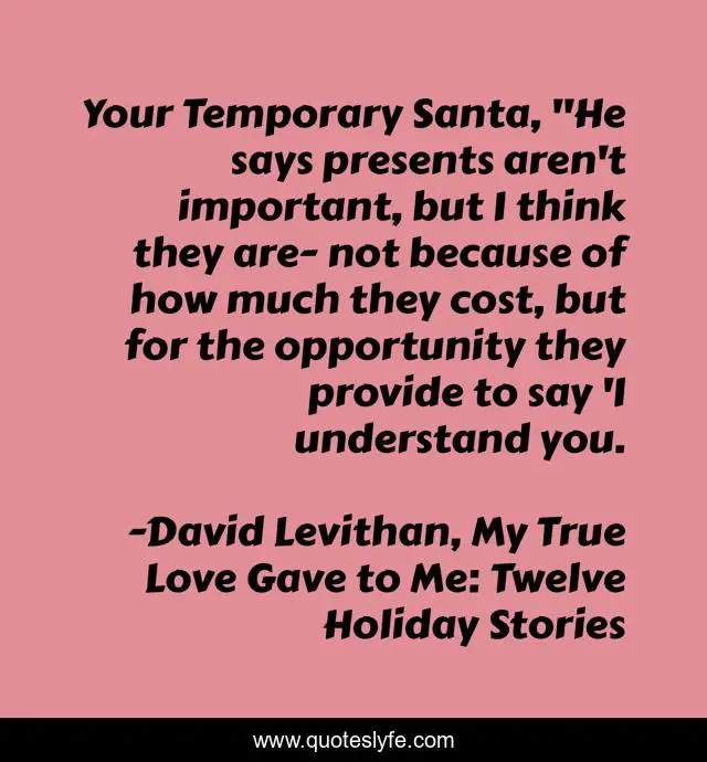 This page presents the quote "Your Temporary Santa, "He says presents aren't important, but I think they are- not because of how much they cost, but for the opportunity they provide to say 'I understand you.". Author of this quote is David Levithan, My True Love Gave to Me: Twelve Holiday Stories. This quote is about gifts, gift-giving, connecting, gift, understanding-others,.
