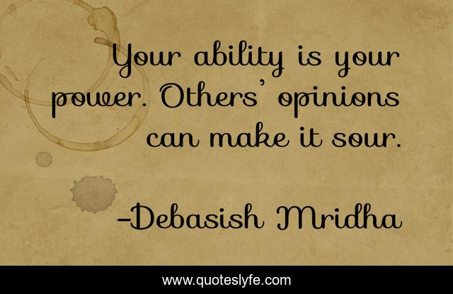This page presents the quote "Your ability is your power. Others’ opinions can make it sour.". Author of this quote is Debasish Mridha. This quote is about opinions, life, love, knowledge, power, inspirational, intelligence, philosophy, wisdom,.