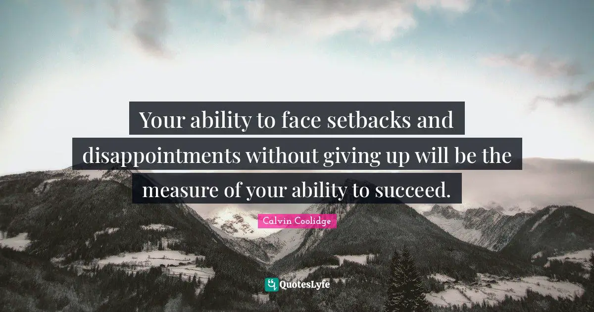 This page presents the quote "Your ability to face setbacks and disappointments without giving up will be the measure of your ability to succeed.". Author of this quote is Calvin Coolidge. This quote is about giving up, ability, faces, succeed, disappointment,.