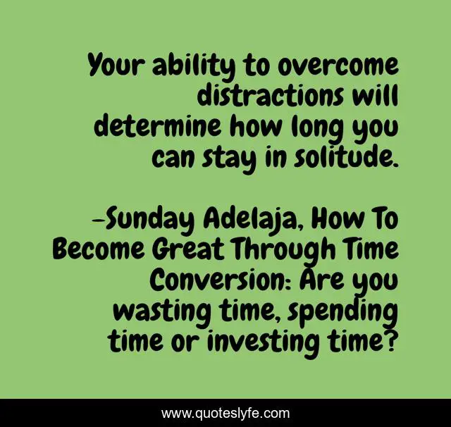 This page presents the quote "Your ability to overcome distractions will determine how long you can stay in solitude.". Author of this quote is Sunday Adelaja, How To Become Great Through Time Conversion: Are you wasting time, spending time or investing time?. This quote is about distractions, solitude, life, conversion, productivity, wealth, overcoming-distraction, greatness, waste,.
