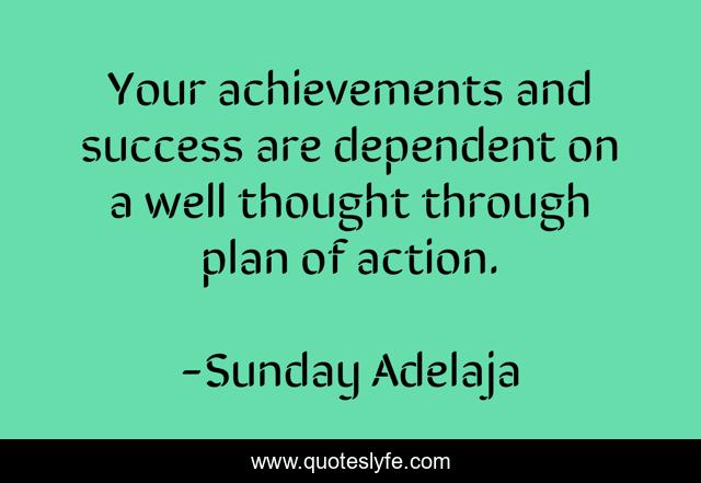 This page presents the quote "Your achievements and success are dependent on a well thought through plan of action.". Author of this quote is Sunday Adelaja. This quote is about action, thought, achievement,.