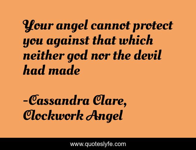 This page presents the quote "Your angel cannot protect you against that which neither god nor the devil had made". Author of this quote is Cassandra Clare, Clockwork Angel. This quote is about devil, angel, god, clockwork-angel, cassandra-clare, automaton,.