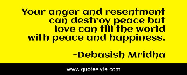 This page presents the quote "Your anger and resentment can destroy peace but love can fill the world with peace and happiness.". Author of this quote is Debasish Mridha. This quote is about life, love, knowledge, inspirational, intelligence, philosophy, wisdom, quotes, affection,.