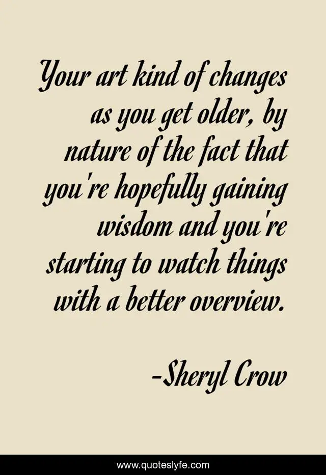 This page presents the quote "Your art kind of changes as you get older, by nature of the fact that you're hopefully gaining wisdom and you're starting to watch things with a better overview.". Author of this quote is Sheryl Crow. This quote is about art, changes, nature,.