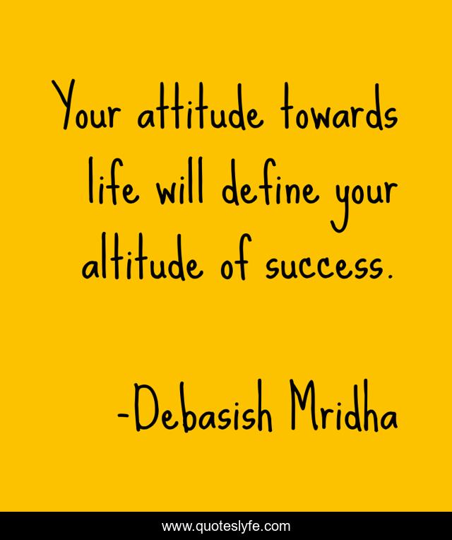 This page presents the quote "Your attitude towards life will define your altitude of success.". Author of this quote is Debasish Mridha. This quote is about altitude-of-success, your-attitude, oscar-wilde, philosophy, debasish-mridha, tagore, behaviour, quotes, attitude,.