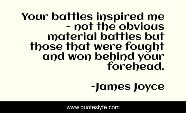 This page presents the quote "Your battles inspired me - not the obvious material battles but those that were fought and won behind your forehead.". Author of this quote is James Joyce. This quote is about irish, mind, battles,.