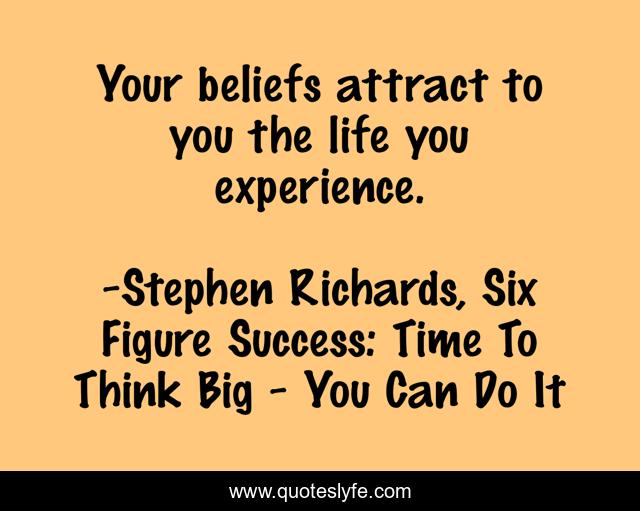 "Stephen Richards, Six Figure Success: Time To Think Big - You Can Do It Quotes." Quoteslyfe.com, 2025. Mon. 08 Dec. 2025. <https://www.quoteslyfe.com/quote/Your-beliefs-attract-to-you-the-life-78073>.