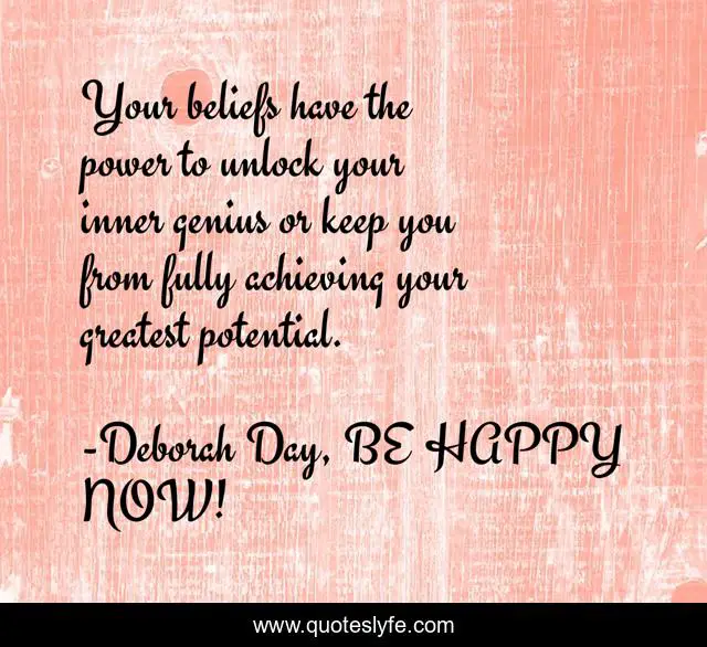 This page presents the quote "Your beliefs have the power to unlock your inner genius or keep you from fully achieving your greatest potential.". Author of this quote is Deborah Day, BE HAPPY NOW!. This quote is about motivational-inspirational, happiness, positive-thinking,.