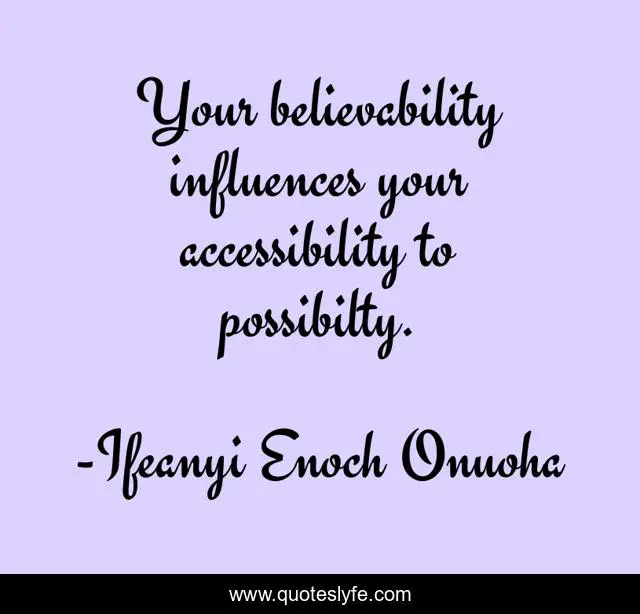 "Ifeanyi Enoch Onuoha Quotes." Quoteslyfe.com, 2025. Mon. 08 Dec. 2025. <https://www.quoteslyfe.com/quote/Your-believability-influences-your-accessibility-to-possibilty-90214>.