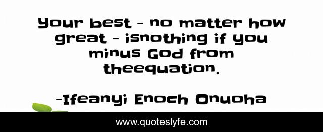 This page presents the quote "Your best - no matter how great - isnothing if you minus God from theequation.". Author of this quote is Ifeanyi Enoch Onuoha. This quote is about life-betterment, god, ifeanyi-enoch-onuoha, inspirational, quote, enthusiasm, nigeria, best, hinovelty,.