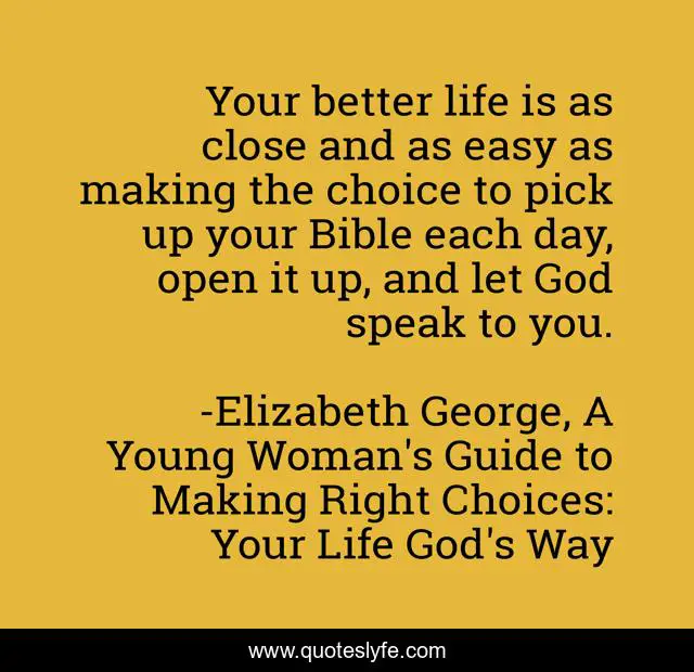 This page presents the quote "Your better life is as close and as easy as making the choice to pick up your Bible each day, open it up, and let God speak to you.". Author of this quote is Elizabeth George, A Young Woman's Guide to Making Right Choices: Your Life God's Way. This quote is about god, young-women, bible, christian, women,.