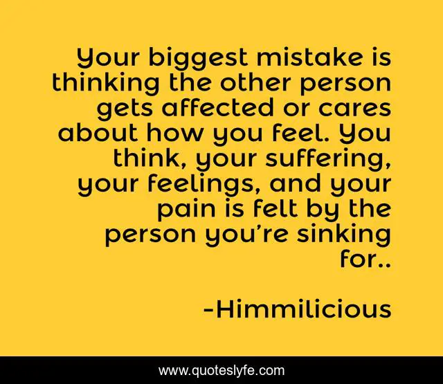 This page presents the quote "Your biggest mistake is thinking the other person gets affected or cares about how you feel. You think, your suffering, your feelings, and your pain is felt by the person you’re sinking for..". Author of this quote is Himmilicious. This quote is about narcissism, love, pain, relationship, affection,.