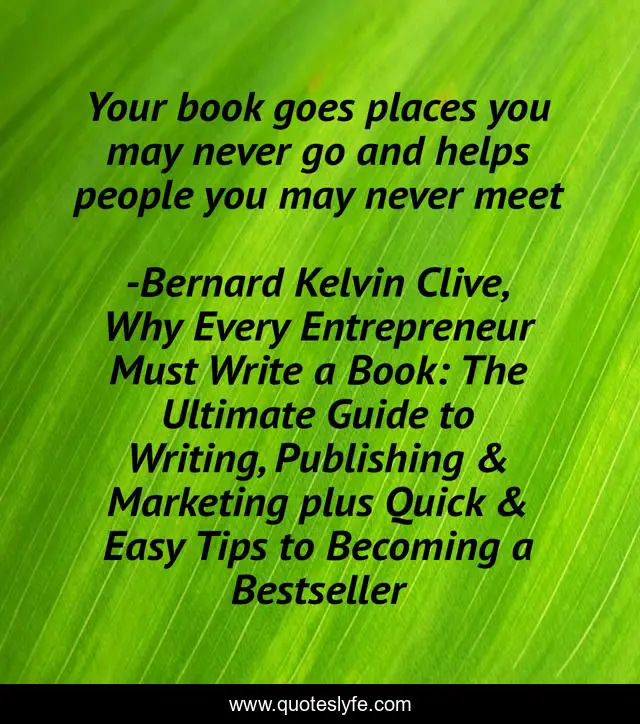 "Bernard Kelvin Clive, Why Every Entrepreneur Must Write a Book: The Ultimate Guide to Writing, Publishing & Marketing plus Quick & Easy Tips to Becoming a Bestseller Quotes." Quoteslyfe.com, 2025. Sat. 06 Dec. 2025. <https://www.quoteslyfe.com/quote/Your-book-goes-places-you-may-never-178535>.