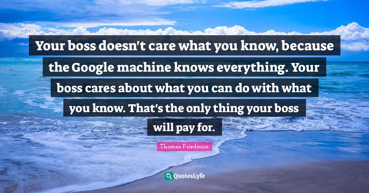 This page presents the quote "Your boss doesn't care what you know, because the Google machine knows everything. Your boss cares about what you can do with what you know. That's the only thing your boss will pay for.". Author of this quote is Thomas Friedman. This quote is about boss, can do, machines, pay, knows, care, google,.