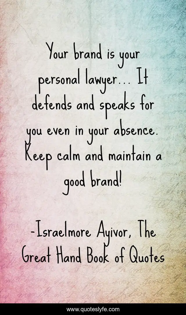 This page presents the quote "Your brand is your personal lawyer... It defends and speaks for you even in your absence. Keep calm and maintain a good brand!". Author of this quote is Israelmore Ayivor, The Great Hand Book of Quotes. This quote is about food-for-thought, defense, brand-yourself, defend, absence, maintain, keep-calm, calm, lawyer,.