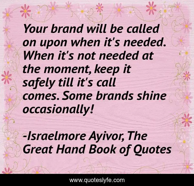 This page presents the quote "Your brand will be called on upon when it's needed. When it's not needed at the moment, keep it safely till it's call comes. Some brands shine occasionally!". Author of this quote is Israelmore Ayivor, The Great Hand Book of Quotes. This quote is about food-for-thought, in-need, emergency, personal, personal-branding, brand, israelmore-ayivor, urgent, occasionally,.