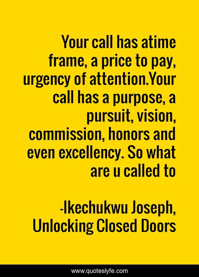 This page presents the quote "Your call has atime frame, a price to pay, urgency of attention.Your call has a purpose, a pursuit, vision, commission, honors and even excellency. So what are u called to". Author of this quote is Ikechukwu Joseph, Unlocking Closed Doors. This quote is about prayer-life, christian-living, self-help-book,.