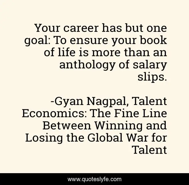 This page presents the quote "Your career has but one goal: To ensure your book of life is more than an anthology of salary slips.". Author of this quote is Gyan Nagpal, Talent Economics: The Fine Line Between Winning and Losing the Global War for Talent. This quote is about career, life-lesson, life, goals, purpose,.