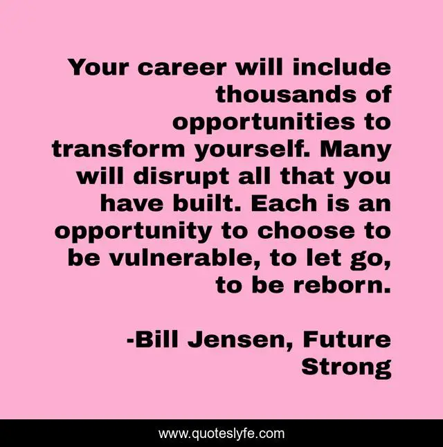 This page presents the quote "Your career will include thousands of opportunities to transform yourself. Many will disrupt all that you have built. Each is an opportunity to choose to be vulnerable, to let go, to be reborn.". Author of this quote is Bill Jensen, Future Strong. This quote is about enthusiasm, future, leadership, inspirational, self-help,.