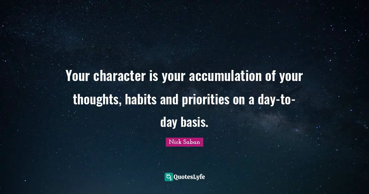 This page presents the quote "Your character is your accumulation of your thoughts, habits and priorities on a day-to-day basis.". Author of this quote is Nick Saban. This quote is about character, habit, accumulation, priorities,.